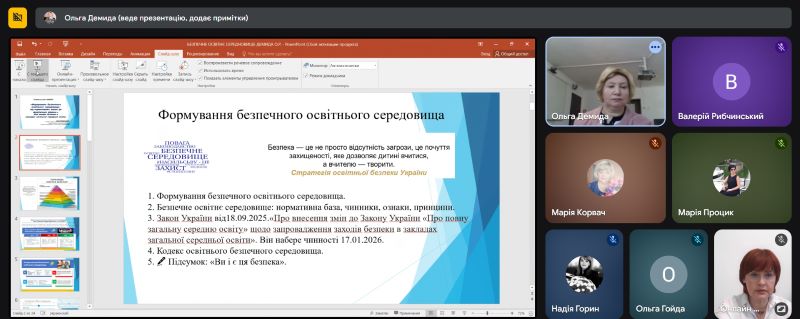 О. Р. Демида, методист відділу освітнього адміністрування та відділу методики навчальних предметів суспільно-гуманітарного та естетичного циклів, визначила нові виміри безпеки в закладі загальної середньої освіти, ознайомити з змінами до Закону України ’’Про повну загальну середню освіту» щодо запровадження заходів безпеки в закладах освіти’’